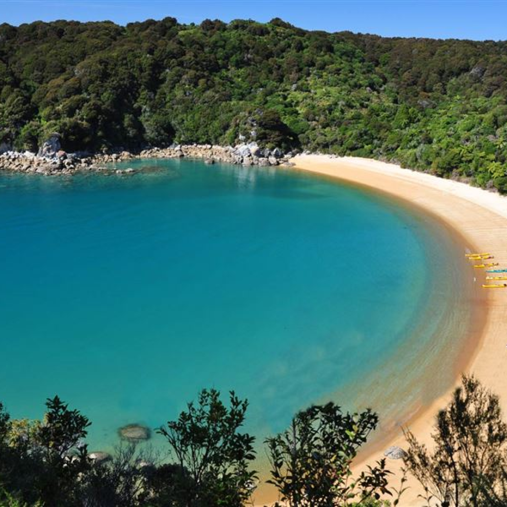 Kayakers exploring the turquoise waters of Abel Tasman.